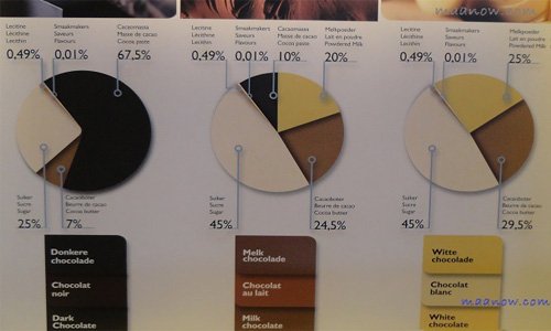 พอเห็นส่วนผสมต่างๆในช็อกโกแล็ต ทุกท่านก็คงจะทราบกันแล้วว่า ช็อกโกแลตทั้ง 3 นั้นมีความแตกต่างกัน จะเห็นได้ว่าไวท์ช็อคโกแล็ต หรือช็อกโกแลตขาวนั้นไม่มีโกโก้แมสหรือผงโกโก้อยู่เลย ซึ่งผลิตขึ้นมาสำหรับคนที่ทานโกโก้แมสไม่ได้ เวลาเลือกซื้อช็อกโกแลต แล้วอยากทราบว่าเป็นช็อกโกแลตแท้หรือไม่ ก็ให้พลิกดูส่วนที่ระบุไว้บนฉลากนะคะ